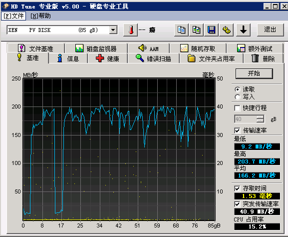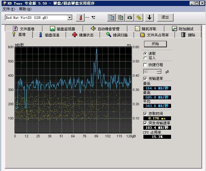 Tune專業(yè)版”中的“基準(zhǔn)”測試功能即可測試出磁盤的吞吐量,一般傳統(tǒng)機械sata硬盤的順序讀寫速度為 :80~150M/s, SAS硬盤為150~200M/s,SSD固態(tài)硬盤為400~600M/s。