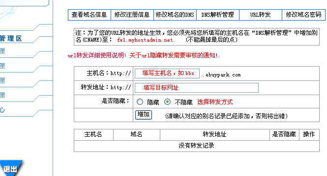 域名解析演示視頻 域名轉(zhuǎn)發(fā)演示視頻 URL轉(zhuǎn)發(fā)是指當(dāng)用戶在瀏覽器輸入某個(gè)域名時(shí),打開此域名對(duì)應(yīng)的另外一個(gè)網(wǎng)址.例如,將http://bbs.ebuypark.com轉(zhuǎn)發(fā)到http://www.ebuypark.com/bbs時(shí),用戶輸入bbs.ebuypark.com訪問(wèn)的實(shí)際是www.ebuypark.com/bbs的內(nèi)容. 轉(zhuǎn)發(fā)方式有兩種:隱藏與非隱藏,采用隱藏轉(zhuǎn)發(fā)時(shí),用戶在瀏覽器地址欄看到的是原來(lái)的域名,如上例,用戶輸入bbs.ebuypark.com時(shí)訪問(wèn)的雖是http://www.ebuypark.com/bbs的內(nèi)容,但瀏覽器地址欄顯示的還是"bbs.ebuypark.com",而采用非隱藏轉(zhuǎn)發(fā)時(shí),瀏覽器地址欄將顯示實(shí)際地址http://www.ebuypark.com/bbs. 我司注冊(cè)的域名支持隱藏與非隱藏轉(zhuǎn)發(fā),但隱藏轉(zhuǎn)發(fā)需要通過(guò)審核才能生效!