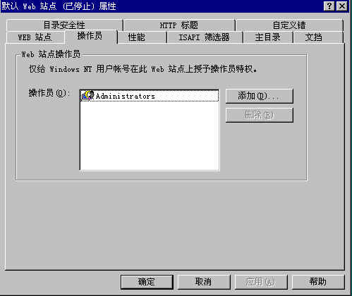 | 通過該項(xiàng)可以在NT用戶帳號(hào)中指定對(duì)站點(diǎn)擁有操作權(quán)的用戶帳號(hào)(注:操作員帳號(hào)不一定必須是 Windows NT