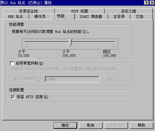 | 性能調(diào)整--可以根據(jù)站點(diǎn)的具體情況設(shè)定每天訪問站點(diǎn)的人數(shù)。該項(xiàng)可以相應(yīng)的調(diào)整Web站點(diǎn)所占用的系統(tǒng)內(nèi)存的大小。