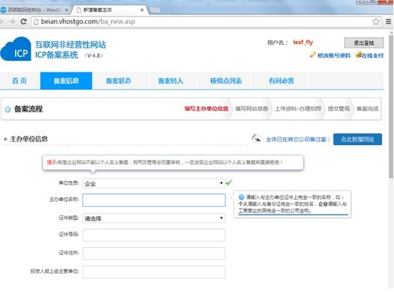 2.參照平臺(tái)提示填寫(xiě)公司名稱、網(wǎng)站負(fù)責(zé)人信息、域名等資料,如下圖: