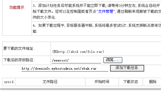 b)"下載后存放路徑"保持默認(rèn)的/wwwroot/不變,在“添加下載任務(wù)”前填寫“http://downinfo.myhostadmin.net/ebak.rar”并點(diǎn)擊“添加下載任務(wù)”,