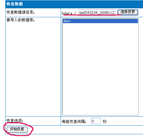 當(dāng)新的數(shù)據(jù)庫信息設(shè)置完畢后,點(diǎn)擊左側(cè)的“恢復(fù)數(shù)據(jù)”,選擇剛才備份的目錄,并點(diǎn)擊“開始”恢復(fù)即可(圖9)