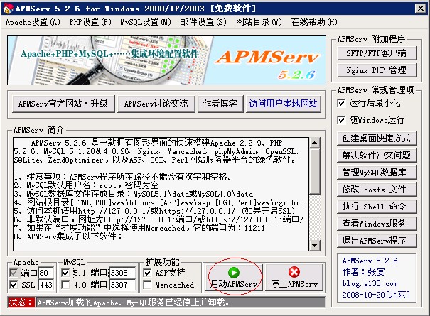 軟件說(shuō)明: APMServ 5.2.6 是一款擁有圖形界面的快速搭建Apache 2.2.9、PHP 5.2.6、MySQL 5.1.28&4.0.26、Nginx 0.7.19、Memcached 1.2.4、phpMyAdmin 2.11.9.2、OpenSSL、SQLite、ZendOptimizer,以及ASP、CGI、Perl網(wǎng)站服務(wù)器平臺(tái)的綠色軟件。無(wú)需安裝,具有靈活的移動(dòng)性,將其拷貝到其它目錄、分區(qū)或別的電腦時(shí),均只需點(diǎn)擊APMServ.exe中的啟動(dòng)按鈕,即可自動(dòng)進(jìn)行相關(guān)設(shè)置,將Apache和MySQL安裝為系統(tǒng)服務(wù)并啟動(dòng)。APMServ集合了Apache穩(wěn)定安全的優(yōu)點(diǎn),并擁有跟IIS一樣便捷的圖形管理界面,同時(shí)支持MySQL 5.0 & 4.0兩個(gè)版本,虛擬主機(jī)、虛擬目錄、端口更改、SMTP、上傳大小限制、自動(dòng)全局變量、SSL證書(shū)制作、緩存性能優(yōu)化等設(shè)置,只需鼠標(biāo)一點(diǎn)即可完成。