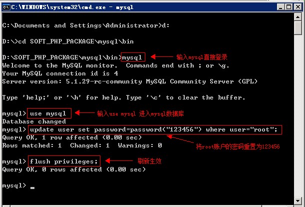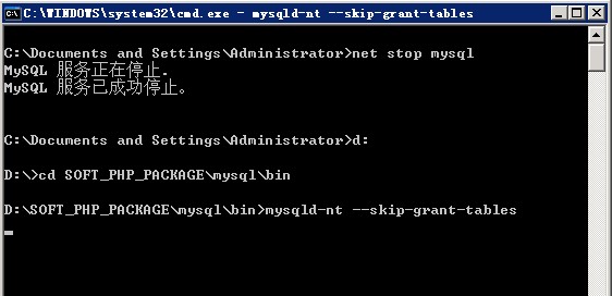 windows/linux 命令行方式重置mysql的root密碼Windows環(huán)境的找回方法: 1、打開cmd命令窗口,先輸入命令: net stop mysql 回車 #關(guān)閉mysql服務(wù)。 進入到D:\SOFT_PHP_PACKAGE\mysql\bin\ 目錄下,執(zhí)行mysqld --skip-grant-tables 啟動MySQL Server (如果報錯,執(zhí)行mysqld-nt --skip-grant-tables)如圖: