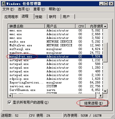 3、關(guān)閉兩個命令窗口,此時還無法啟動mysql因為mysql進程還在運行中,打開任務(wù)管理器,找到mysqld開頭的進程,點結(jié)束進程,如圖: