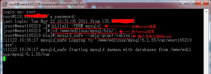 linux環(huán)境的找回方法: 1、ssh登陸到linux服務(wù)器,向mysqld server 發(fā)送kill命令關(guān)掉mysqld server(不是 kill -9),存放進程ID的文件通常在mysql的數(shù)據(jù)庫所在的目錄中。(命令輸入部分用紅色標注) #cd /www/wdlinux/mysql/bin/ #mysqld_safe --skip-grant-tables 啟動后的狀態(tài),如圖: