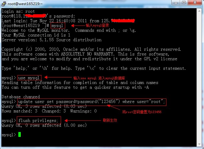 3、 原有的ssh客戶端不要關(guān)閉(若該客戶端超時,可能導(dǎo)致重置密碼失敗,所以重置密碼過程建議在幾分鐘內(nèi)完成),新開一個ssh客戶端登陸,登陸后輸入mysql命令登陸到mysql: >mysql 然后輸入以下命令重置密碼: 如圖: