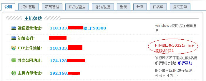 4、使用FTP軟件連接時(shí),端口不是21,比如您遠(yuǎn)程連接端口是5**00,則FTP端口是5**21。您登錄到我司管理中心——業(yè)務(wù)管理——獨(dú)立IP主機(jī)管理中,可以查看到端口號(hào)。如圖: ![]() 如果根據(jù)以上教程設(shè)置后FTP還是無(wú)法連接,請(qǐng)檢查您的FTP軟件是否開啟PASV模式,或提交工單咨詢我司技術(shù)工程師。