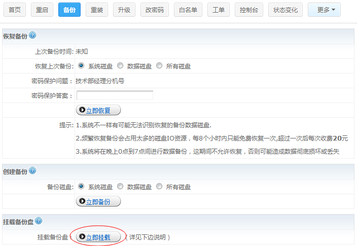 VPS/云主機如何掛載備份盤Windows系統(tǒng)掛載備份盤: 1、登錄我司網(wǎng)站——業(yè)務(wù)管理——獨立IP主機管理,選擇您需要操作的獨立IP主機,點“管理”,進入后點擊“備份”,再點擊“立即掛載”。