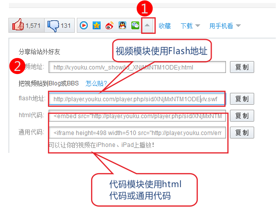 添加視頻模塊和Flash模塊1. 添加視頻模塊: 建站系統(tǒng)可以通過兩種方方式去添加視頻。 1) 視頻URL添加法。這種添加法允許添加的是其它站點的視頻URL 第一步:在視頻源網(wǎng)站找到該視頻的URL鏈接地址,該鏈接地址必須以.mp4或者.flv結尾,復制好以備用 以下以優(yōu)酷為例