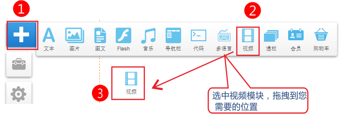 第二步:添加視頻。 剛才已經(jīng)找出需要添加的視頻的URL,要將這個視頻添加到頁面中,點擊左邊的添加按鈕,將視頻模塊拖至頁面上,會彈出設置窗口,將第一步中準備的URL添加后保存,并預覽即可見到效果。 1.依次點擊 添加按鈕-》視頻。選中模塊拖拽到您需要的位置。