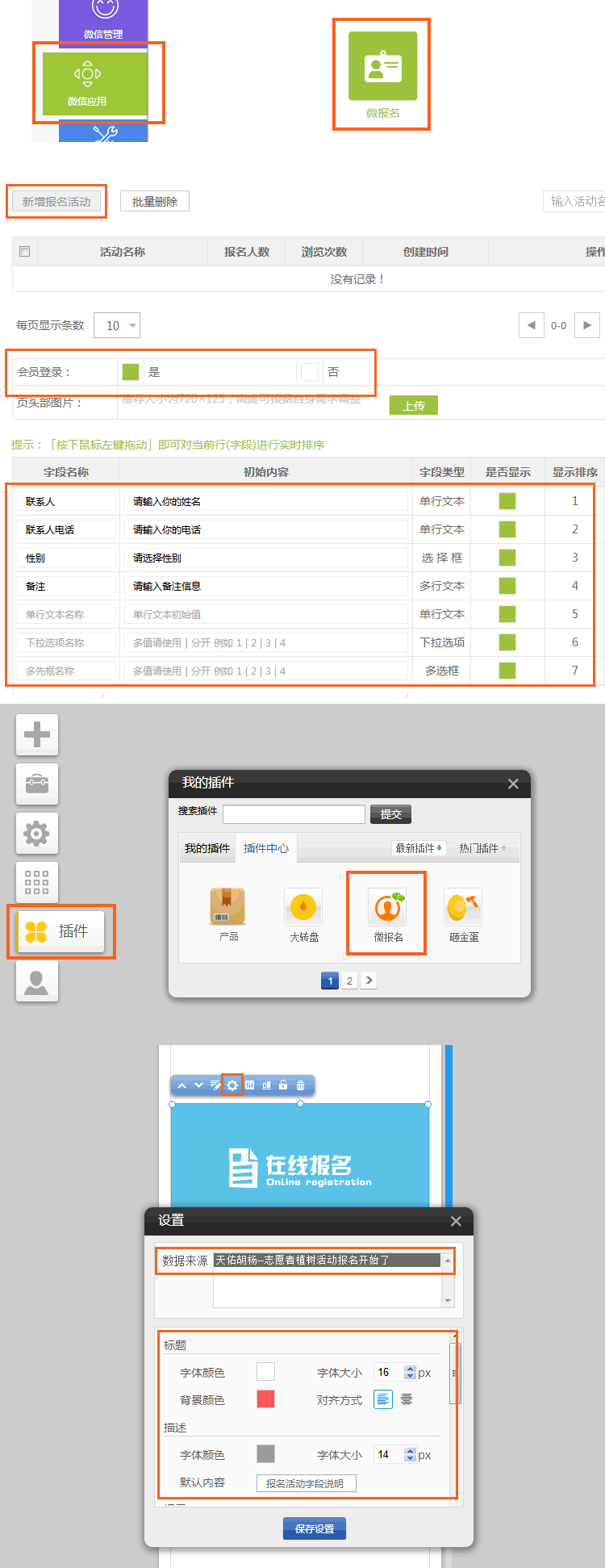 微信應(yīng)用-微報(bào)名后臺(tái):可以添加多個(gè)報(bào)名活動(dòng),自定義報(bào)名表單內(nèi)容,設(shè)定是否需要會(huì)員登錄,查看報(bào)名參加人員