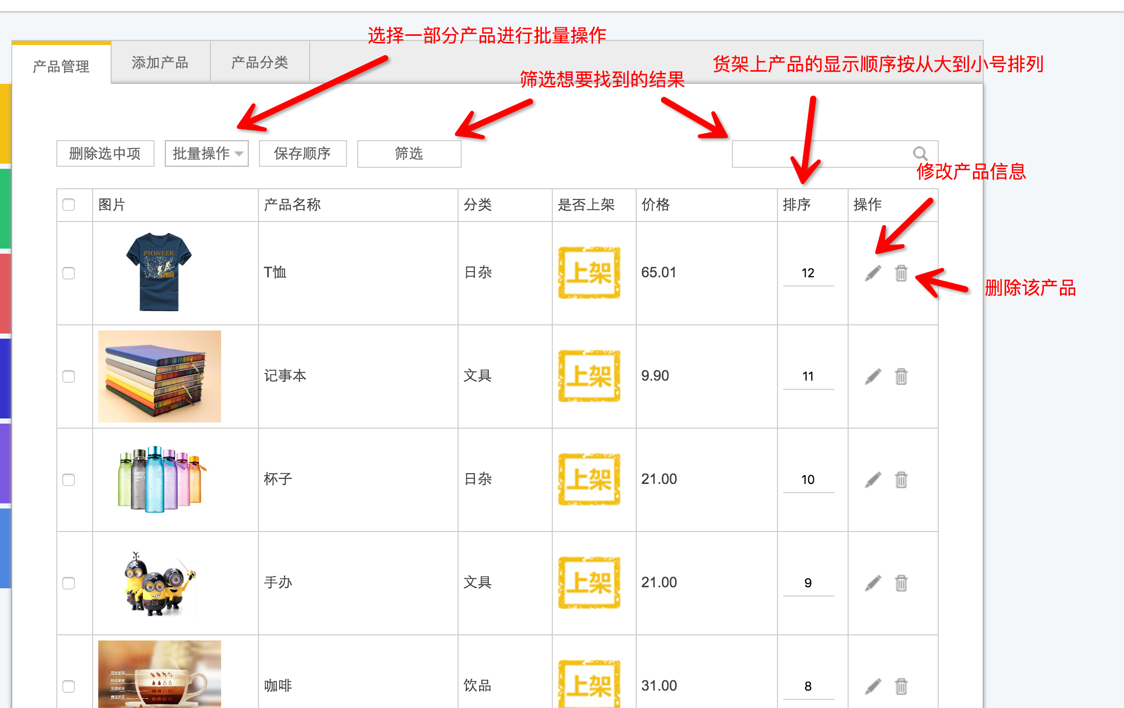 注意:篩選條件包括分類,名稱,產品價格,產品原價