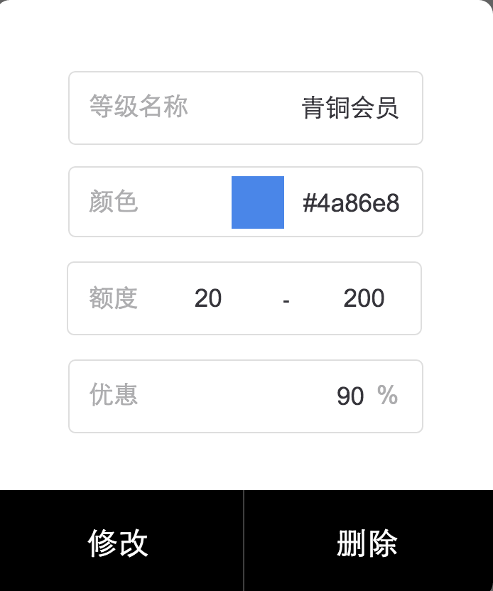 會(huì)員等級(jí)的編輯,點(diǎn)開某個(gè)會(huì)員等級(jí)就會(huì)出現(xiàn)下面的彈窗并進(jìn)行修改
