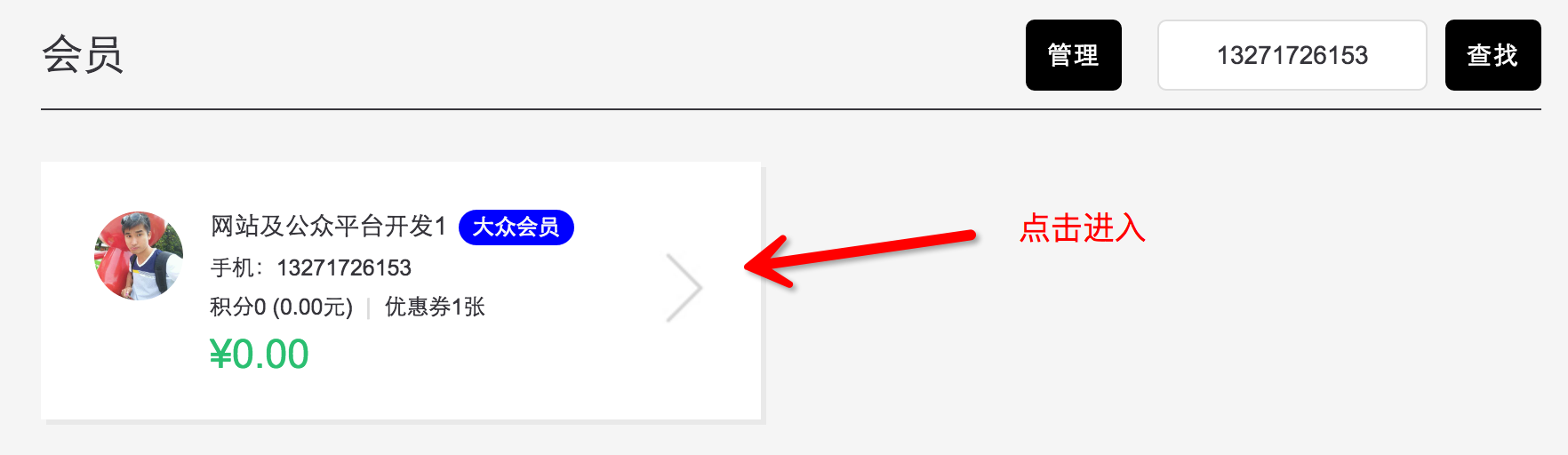 2、后臺下單首先獲取用戶信息,用戶可以通過告訴手機(jī)號的形式,也可以掃描二維碼 (1)通過手機(jī)號查找會員