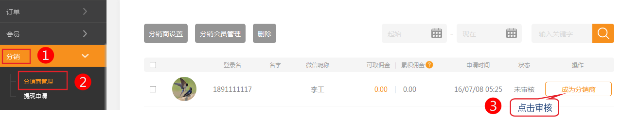 1.如果關(guān)閉自動(dòng)審核功能,用戶在申請(qǐng)后需在在分銷商管理中手動(dòng)審核。 1.依次點(diǎn)擊分銷-》分銷商自動(dòng)審核-》開啟自動(dòng)審核功能。 (注意:該申請(qǐng)會(huì)員的訂單金額滿足限制金額,且訂單狀態(tài)必須是交易完成(付款/發(fā)貨/收貨確認(rèn)完成)