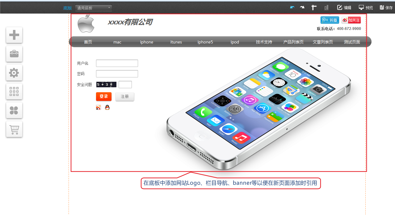 4、在底板中添加logo、banner、導(dǎo)航等以便在新添加的頁(yè)面中引用。最后記得點(diǎn)擊右上角的保存按鈕 5、底板的應(yīng)用