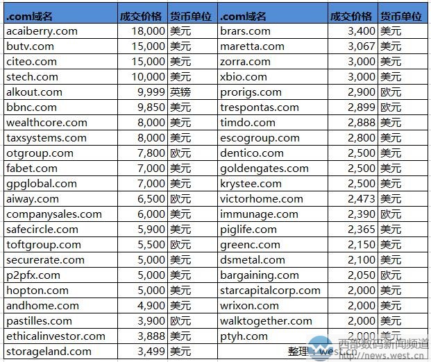 Sedo交易榜:“巴西莓”域名以12萬元領(lǐng)銜!終端買了個五字母citeo.com西部數(shù)碼(west.cn)7月12日消息,最新一期的sedo交易榜出爐,本期上榜的域名共有56個,其中賣價最貴的是英文域名acaiberry.com,成交價為18,000美元,約合人民幣12萬元。