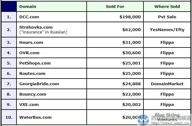 DN榜:三字母域名DCC.COM以134萬(wàn)元奪冠!“保險(xiǎn)”域名被終端拿下西部數(shù)碼(west.cn)7月14日消息,本期的DN交易榜(7.3-7.9)上,高價(jià)成交的域名還不少,一掃往日夏季域名市場(chǎng)蕭條的狀態(tài)。本期奪得DN榜冠軍的是三字母域名DCC.COM,成交價(jià)為19.8萬(wàn)美金,約合人民幣134萬(wàn)元。 域名DCC.COM注冊(cè)于1997年9月,距今快20年歷史了。作為ABB型域名,DCC.COM品相出眾,簡(jiǎn)短易記,而且又是三聲母域名,對(duì)應(yīng)諸多豐富詞語(yǔ),比如“多查查、調(diào)查處、冬蟲(chóng)草、搭錯(cuò)車(chē)、電磁場(chǎng)、大操場(chǎng)、電池廠”等,可廣泛用于醫(yī)療、科學(xué)、信息查詢(xún)、交通出行等領(lǐng)域,應(yīng)用空間很大。據(jù)了解,域名DCC.COM是私下交易的,其高達(dá)134萬(wàn)元的成交價(jià)讓其躋身目前為止今年成交價(jià)最高的20強(qiáng)域名之列。 排名第二的是域名Strahovka.com,成交價(jià)為62,000美元,約合人民幣42萬(wàn)元。這個(gè)域名注冊(cè)于2005年5月,是俄語(yǔ)中“保險(xiǎn)”的意思,特別適合搭建保險(xiǎn)行業(yè)終端網(wǎng)站。據(jù)whois查詢(xún),域名Strahovka.com已在7月7日轉(zhuǎn)移到了終端買(mǎi)家payoneer.com名下。 隨后是以31,000美元和30,600美元在Flippa平臺(tái)成交的域名hours.com和ovr.com,約合人民幣21萬(wàn)元。前者是英語(yǔ)常用單詞,是“小時(shí)、時(shí)辰”的意思,可用來(lái)搭建服飾、美容、以及在線電商等終端網(wǎng)站,應(yīng)用空間不錯(cuò)。后者ovr.com則有“哦VR”的意思,適合用于虛擬現(xiàn)實(shí)領(lǐng)域。 本期榜單的第五名來(lái)自英文組合域名petshops.com,成交價(jià)為25,001美元,約合人民幣17萬(wàn)元。該域名早在1996年就已注冊(cè),其“寵物店、寵物商店”的含義清晰,指向明確,非常適合搭建寵物銷(xiāo)售網(wǎng)站或者寵物其他相關(guān)服務(wù)平臺(tái)。 另外,緊隨其后的域名routes.com也拍出25,0000美元價(jià)格,該域名是“路徑、路途”的意思,可搭建旅行相關(guān)平臺(tái)。其他域名,比如 “快活”Bouncy.com、vxe.com、“水上巴士”waterbus.com、“洋蔥”O(jiān)nions.com、“打印、印刷”P(pán)rint.net等也以不錯(cuò)價(jià)格成交。 其他交易域名詳見(jiàn)下圖: