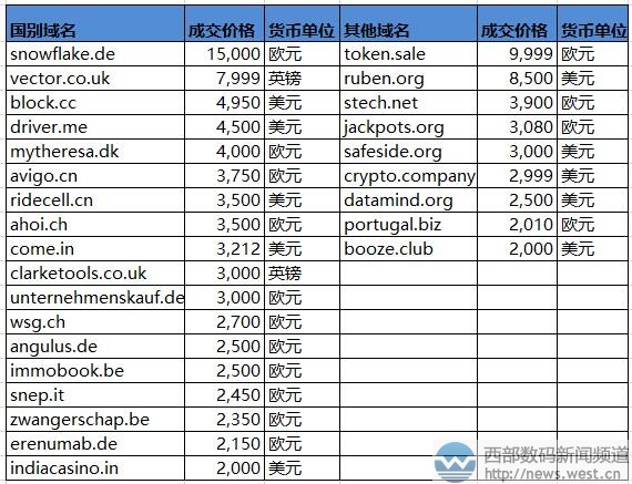 國(guó)別域名方面,來(lái)自德國(guó)的域名snowflake.de以15,000歐元結(jié)拍,約合人民幣11.5萬(wàn)元。其主體英文snowflake卻有“雪花、雪片”的中文含義,不少相關(guān)域名的成交價(jià)都不錯(cuò)。比如,snowflakedb.com曾在2014年被SnowFlake Computing(雪花計(jì)算)公司以近4萬(wàn)元的價(jià)格收購(gòu);英文域名snowflake.co.uk也在今年5月底拍出了約10.6萬(wàn)元的價(jià)格。 其他域名方面,本期三枚新頂級(jí)域名榜上有名。其中,token.sale有“代幣銷售”的意思,很適合搭建虛擬貨幣電商類平臺(tái),成交價(jià)為9,999歐元,約合人民幣8萬(wàn)元。同樣適合虛擬貨幣領(lǐng)域的還有域名crypto.company,成交價(jià)為2,999美元,該域名有“加密公司”的意思,可用于加密貨幣平臺(tái)。除此以外,新頂級(jí)域名booze.club也以2000美元的結(jié)拍價(jià)上榜。 本文轉(zhuǎn)載自新聞資訊,原文鏈接:Sedo榜:“工作”類域名以20萬(wàn)元領(lǐng)銜!3個(gè)新頂級(jí)域名表現(xiàn)搶眼!