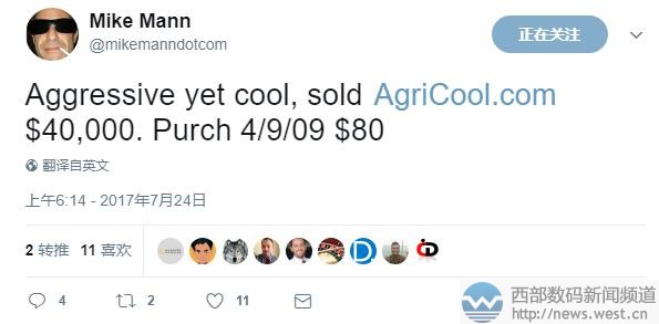 成本僅80美元!Mike Mann以27萬(wàn)元售出“農(nóng)業(yè)”域名西部數(shù)碼(west.cn)7月25日消息,昨天國(guó)外大佬Mike Mann發(fā)推稱,英文域名AgriCool.com以40,000美元成交,約合人民幣27元。而這枚域名當(dāng)時(shí)的成本僅為80美元,人民幣539元。