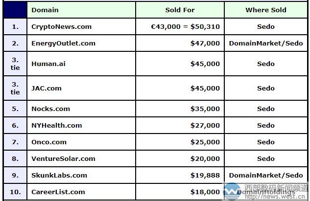 域名cryptonews.com注冊于1999年,主體由crypto和news組合而成,具有“加密消息”的意思,用來搭建網(wǎng)絡(luò)安全平臺比較合適。另外,今年以來加密貨幣(CryptoCurrency)等虛擬貨幣行情不錯,Crypto news也可指代加密貨幣方面的新聞,用來搭建相關(guān)資訊平臺也很合適。據(jù)查詢發(fā)現(xiàn),相關(guān)域名cryptonews.biz/.org目前均已建站。 排名第二的是域名energyoutlet.com,成交價為47,000美元,約合人民幣31萬元。該域名由英文單詞“energy”(能源)和“Outlet”(出口、批發(fā))組合而成,適合用于能源相關(guān)領(lǐng)域名。 本期DN榜上,國別域名human.ai表現(xiàn)不錯,以45,000美元的成交價躋身三強。.ai后綴原是烏拉圭國別域名,但因其與人工智能(Artificial Intelligence)相對應(yīng),后多用于人工智能領(lǐng)域。域名human.ai代表有“人、人類”的意思,是很常見的英語詞匯,用來搭建人工智能相關(guān)平臺價值不錯。 與Human.ai并列第三的還有三字母域名jac.com,該域名注冊于1995年3月,在中文里有“聚愛財”的含義,非常適合搭建金融理財平臺。除此以外,jac.com還對應(yīng)有不少終端,比如jac江淮汽車(jac.com.cn)、JAC外貿(mào)實戰(zhàn)博客(jacindustry.org)、JAC服裝品牌設(shè)計(jacline.cn)等等。 除此以外,因為域名nocks.com(作凹痕于、箭扣)以35,000美元成交;組合域名nyhealth.com(紐約健康)以27,000美元成交;onco.com(致癌)成交價為25,000美元。其他域名也有不錯表現(xiàn),交易詳見下圖: