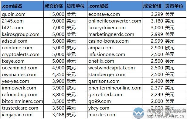 域名quoin.com注冊(cè)于2001年6月,是英文單詞“突角、隅石”的意思。從含義上看,該域名并沒有什么特別之處,不過卻對(duì)應(yīng)有軟件公司QuoinInc以及女性飾品品牌Quoin,由此可見可應(yīng)用的領(lǐng)域很廣。目前域名quoin.com被德國一家資訊網(wǎng)站收購,官網(wǎng)域名為t-online.de。 本期sedo榜上,.com域名表現(xiàn)平平。排名第二的數(shù)字域名2145.com成交價(jià)為9000美元,約合人民幣6萬元。該域名注冊(cè)于1999年,距今已經(jīng)18年歷史了,擁有一般四數(shù)字域名的短小精湛和建站不受限制等優(yōu)勢(shì),市場(chǎng)價(jià)值比較堅(jiān)挺。 隨后是雜米域名bt21.com,成交價(jià)為7000美元,從品相和含義上分析,該域名比較適合搭建比特幣交易及游戲平臺(tái)。除此以外,本期sedo上多個(gè)英文域名成交,比如cointime(硬幣時(shí)間)、adsoul.com(廣告靈魂)均以5000美元結(jié)拍。