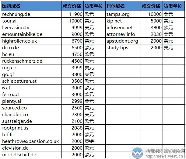 國別域名方面,德國域名再次名列前茅。繼上周rechnung24.de以18,000歐元奪得第一后,本期rechnung.de又以11,900歐元成交,約合人民幣9.3萬元!皉echnung”有“賬單”的意思,適合搭建財(cái)務(wù)票務(wù)類網(wǎng)站。 除了.de域名,安圭拉國家域名tour.ai也以10,000美元成交,人民幣大概是6.6萬元。“tour”是“旅游、觀光”的意思,在全球都是非常通用的詞語,所以域名tour.ai很適合搭建旅游平臺(tái)。 其他域名方面,tampa.org成交價(jià)為10000美元,對(duì)應(yīng)有美國佛羅里達(dá)州西部港市——坦帕,適合搭建地方政務(wù)以及門戶類網(wǎng)站,另外旅游、招聘等生活類平臺(tái)也可使用該域名。 本文轉(zhuǎn)載自新聞資訊,原文鏈接:Sedo榜:終端近10萬元買下“突角”域名!兩枚國別域名表現(xiàn)搶眼