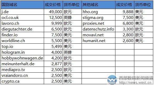 西部數(shù)碼(west.cn)11月15日消息,據(jù)外媒消息,最新一期的sedo交易榜剛剛出爐。本期共有63個(gè)域名超2000美元成交,其中冠軍由國(guó)別單字母域名j.de以49,000歐元摘得,約合人民幣38萬(wàn)元。三字母ani.com則以49,000美元屈居第二,約合人民幣32萬(wàn)元。