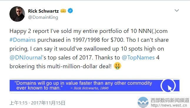 “域名大王”Rick一連出售10個三數(shù)字域名!美圖收購 “青年會所”域名西部數(shù)碼(west.cn)11月21日消息,據(jù)namepros在論壇曝料稱,近日知名投資大佬“域名大王”Rick Schwartz出售了包括346.com、348.com等在內(nèi)的10個三數(shù)字域名,交易總額達(dá)數(shù)百萬美元。與此同時,美圖秀秀公司拿下了英文組合域名PartyNow.com。