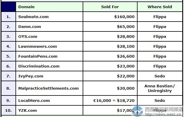來(lái)源西部數(shù)碼新聞資訊,原文鏈接:英文域名“靈魂伴侶”以108萬(wàn)元高居DN榜首!