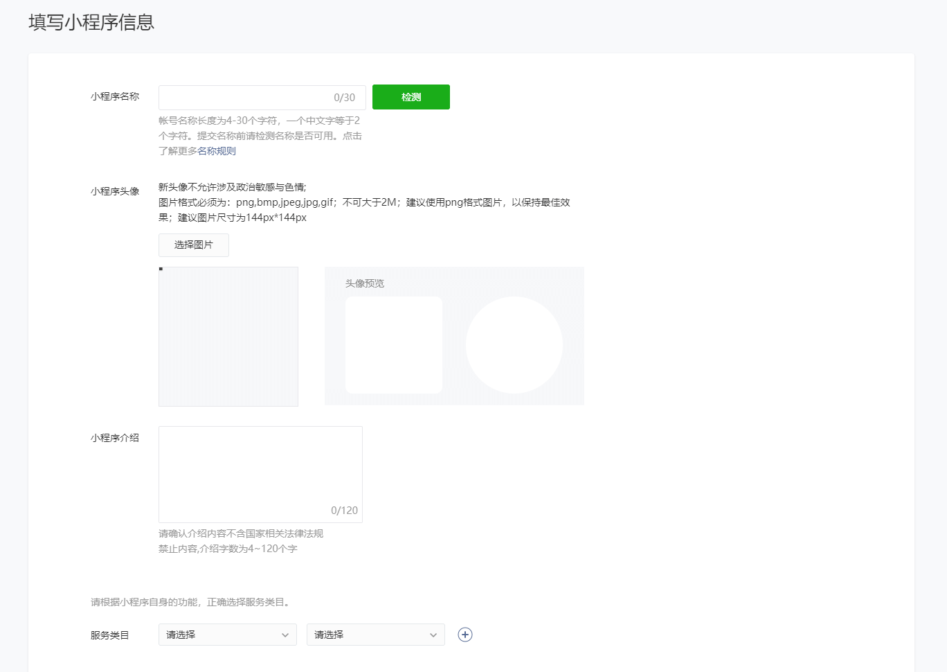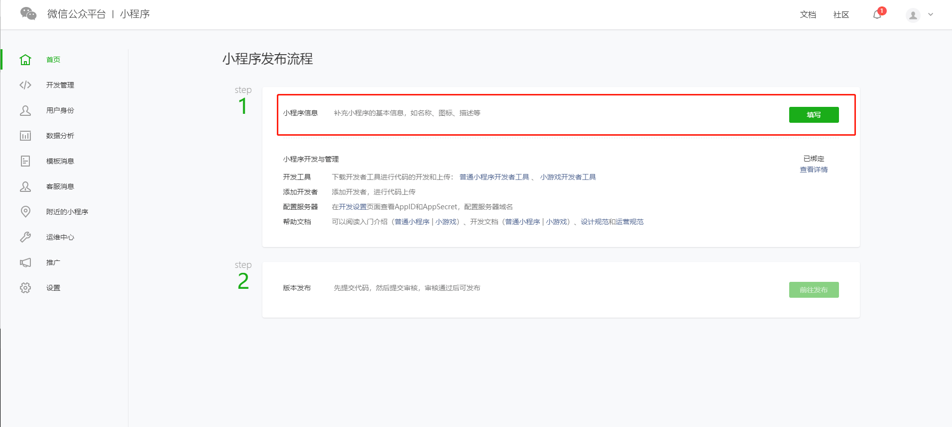 2.完善小程序信息注冊(cè)小程序后,登錄小程序后臺(tái)首頁(yè),點(diǎn)擊【填寫】完善小程序信息,如名稱、圖標(biāo)、描述等;