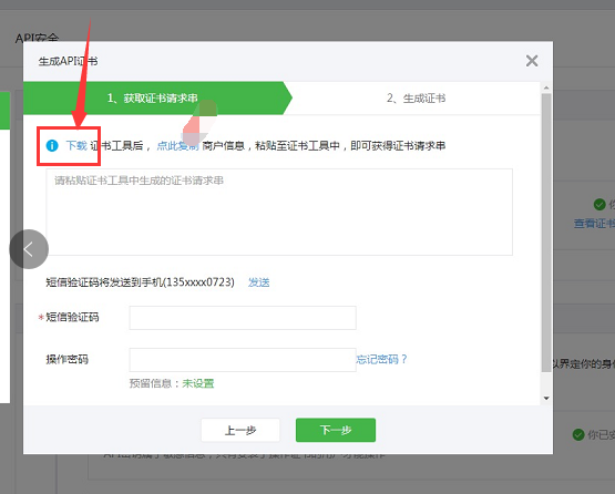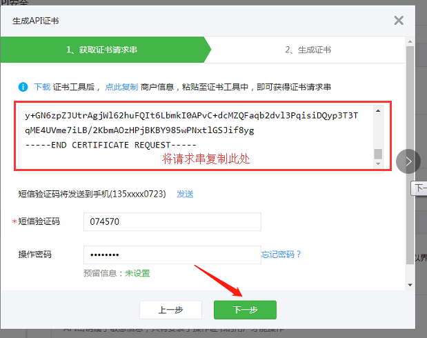 6、在證書工具里復(fù)制的證書串點(diǎn)后返回【微信支付商戶平臺(tái)】,將復(fù)制的證書請(qǐng)求串粘貼至生成aid證書的頁(yè)面,并輸入短信驗(yàn)證碼及操作密碼,點(diǎn)擊下一步