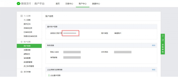 3.2獲取微信支付參數(shù)成功申請(qǐng)小程序微信支付后,通過鏈接https://pay.weixin.qq.com 登錄微信支付商戶平臺(tái),獲取商戶號(hào)、商戶密鑰、下載API支付證書,各參數(shù)獲取說明如下說明: 3.2.1獲取商戶號(hào)點(diǎn)擊“賬戶中心”->“商戶信息”菜單,獲取微信支付商戶號(hào),如下圖示;