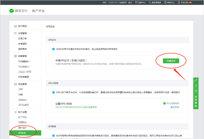 3.2.3 獲取API證書注意:請(qǐng)務(wù)必按照操作流程去下載證書,期間請(qǐng)不要關(guān)閉工具等相關(guān)程序,如生成了證書關(guān)閉工具的話,會(huì)導(dǎo)致證書無法下載,只能等48小時(shí)之后重新生成。(證書一年只能生成3次,下載后請(qǐng)保存好) 一、如何判定證書類型為【權(quán)威CA頒發(fā)的API證書】登錄微信支付商戶平臺(tái)點(diǎn)擊APT安全,出現(xiàn)如下圖所示則為權(quán)威CA頒發(fā)的API證書