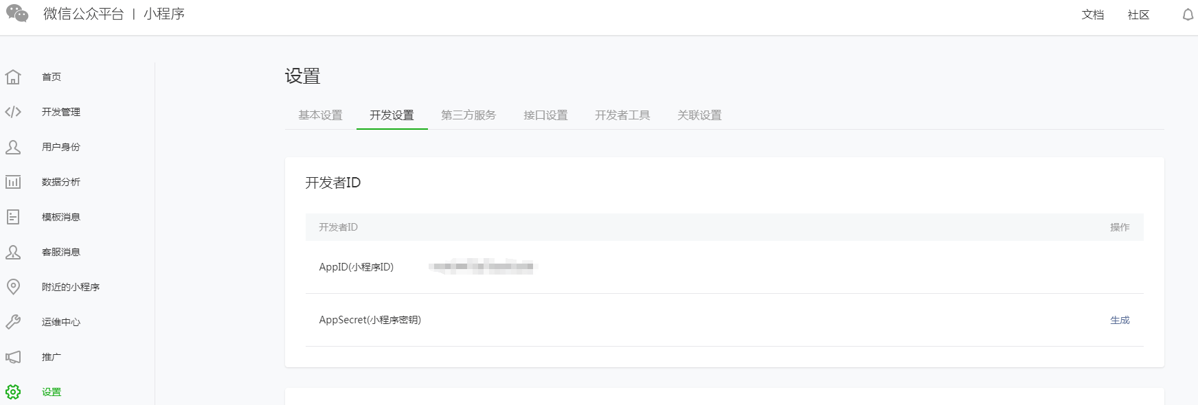 需要注意,AppSecret生成后不會(huì)明文存儲(chǔ)在開發(fā)平臺(tái)上,需要自行妥善保存,一旦遺失需要重新生成,可能會(huì)影響已發(fā)布小程序的正常使用。 2.2配置小程序服務(wù)器域名登錄微信小程序后臺(tái),在設(shè)置——開發(fā)設(shè)置中,配置小程序服務(wù)器域名,詳細(xì)配置如下: