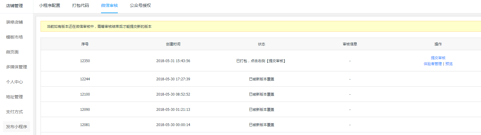1.4提交審核/發(fā)布提交審核:每點(diǎn)擊【一鍵打包】打包小程序,在“微信審核”頁(yè)面會(huì)將會(huì)生成一條打包記錄,點(diǎn)擊【提交審核】將代碼包提交到微信進(jìn)行審核,微信審核周期一般為7個(gè)工作日,在提交審核前請(qǐng)先認(rèn)真閱讀《微信小程序平臺(tái)運(yùn)營(yíng)規(guī)范》和《微信小程序平臺(tái)常見拒絕情形》; 審核通過:微信審核通過后,點(diǎn)擊【發(fā)布】按鈕,稍等片刻,即可在手機(jī)微信小程序搜索中查到已發(fā)布的小程序,完成發(fā)布流程; 審核失。喝缥⑿艑徍耸≌(qǐng)注意可看失敗提示,及時(shí)登錄微信小程序后臺(tái)處理相關(guān)問題; 注意:同一時(shí)間只允許提交審核1個(gè)小程序。
