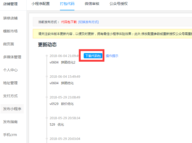 2.代碼下載代碼包下載是在平臺(tái)上下載小程序代碼包,自行通過微信開發(fā)者工具上傳代碼并通過微信公眾平臺(tái)完成小程序?qū)徍、小程序發(fā)布操作,適合對(duì)微信小程序較熟悉的用戶。 2.1配置小程序參數(shù)登錄管理后臺(tái),點(diǎn)擊【店鋪】菜單->點(diǎn)擊【發(fā)布小程序】->點(diǎn)擊【小程序配置】,配置小程序的參數(shù):小程序名稱、AppID、AppSecret,AppID與AppSecret可登錄微信小程序后臺(tái)——設(shè)置——開發(fā)設(shè)置中獲;