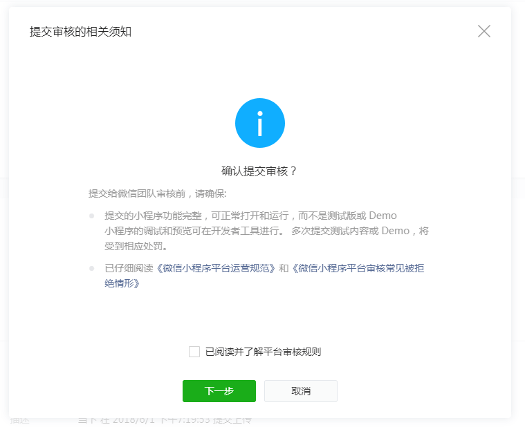 三、注意事項(xiàng)1.在線上傳與代碼包下載兩種小程序發(fā)布方式,同一時(shí)間只能使用其中一種。如果小程序已經(jīng)發(fā)布,隨意切換小程序發(fā)布方式會(huì)導(dǎo)致已發(fā)布的小程序無法正常訪問,必須重新提交審核通過后才能恢復(fù)訪問。2.代碼包下載的方式,將無法在本平臺(tái)對(duì)小程序進(jìn)行預(yù)覽、提交審核以及發(fā)布小程序3.小程序提交審核前,請(qǐng)認(rèn)真閱讀《微信小程序平臺(tái)運(yùn)營(yíng)規(guī)范》和《微信小程序平臺(tái)常見拒絕情形》并仔細(xì)檢查小程序內(nèi)容,提高小程序?qū)徍送ㄟ^的概率。