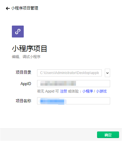 選擇項(xiàng)目目錄,找到并選擇剛解壓的小程序文件夾,點(diǎn)擊確定進(jìn)行添加并輸入小程序的AppID和項(xiàng)目名稱