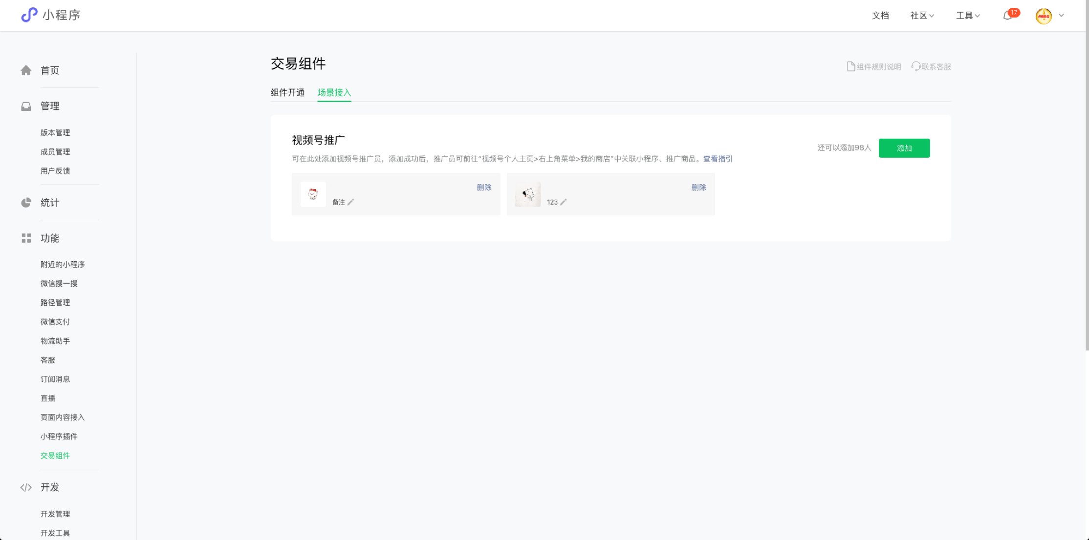 6、在后臺【店鋪-小程序發(fā)布】自行發(fā)布小程序 7、登錄小程序管理后臺(https://mp.weixin.qq.com/ ) 在【功能-交易組件-場景接入-視頻號推廣】點擊【添加】,將需要在視頻號展示商品的微信賬號設(shè)置為推廣員。