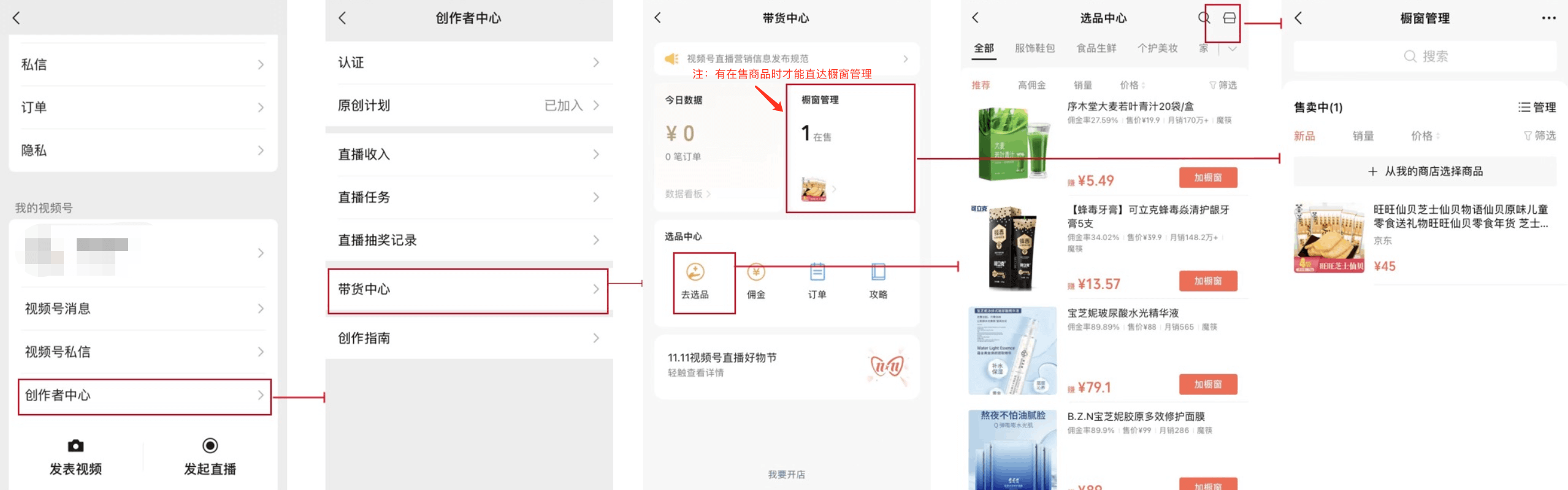 9、在微信的視頻號中點擊【右上角人像標(biāo)志】進(jìn)入視頻號個人中心, 點擊【創(chuàng)作者中心】, 點擊【帶貨中心】, 點擊【去選品或櫥窗管理】進(jìn)入選品中心, 點擊【右上角的店鋪標(biāo)志】,選擇商品添加到櫥窗。即可在視頻號個人主頁展示商品櫥窗同步小程序商品。