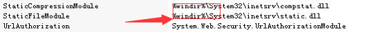 經(jīng)查看站點設置等信息,發(fā)現(xiàn)iis站點》模塊被加入了異常dll,如圖