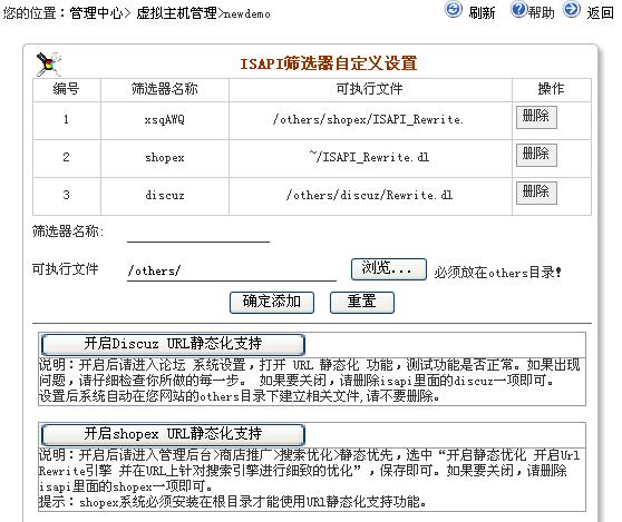 虛擬主機開啟URLrewrite功能的方法介紹我司windows平臺的虛擬主機于2007年4月5日起,免費支持Urlrewrite功能,用戶可以自己在虛擬主機管理中心點擊>isapi篩選器 discuz論壇和shopex網(wǎng)店系統(tǒng)已經(jīng)默認支持,如果您要開啟,只需要在該頁面點“開啟”即可立即生效。 其他系統(tǒng),用戶可以自己將相關(guān)的dll文件上傳至others目錄,并點擊添加 ISAPI篩選器 即可生效!±碚撋峡梢灾С秩魏蜗到y(tǒng)的urlrewrite, 同時可以擴展支持其他isapi篩選功能。 這個功能在業(yè)內(nèi)是絕無僅有的。