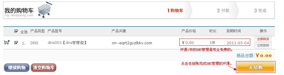 選擇購(gòu)買年限后,然后點(diǎn)擊下一步,默認(rèn)我司提供了一年免費(fèi)的服務(wù)。 4、系統(tǒng)會(huì)自動(dòng)跳轉(zhuǎn)到購(gòu)物車,確認(rèn)好開(kāi)通的域名和年限正確后,點(diǎn)擊“去結(jié)賬”即可完成整個(gè)的購(gòu)買流程。