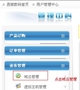 6、回到我司網(wǎng)站的管理中心--業(yè)務(wù)管理,點(diǎn)擊“域名管理”