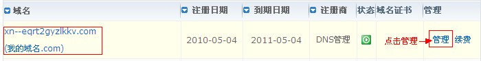 7、在域名管理中找到剛才開(kāi)通的DNS管理,點(diǎn)擊右側(cè)的“管理”: