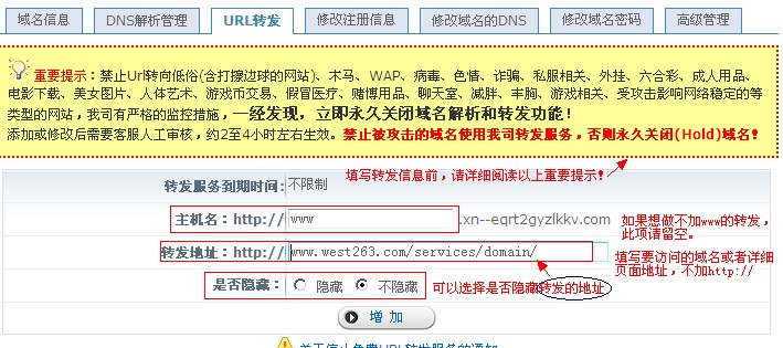在設(shè)置轉(zhuǎn)發(fā)前,先仔細(xì)閱讀“重要提示”,確定您的轉(zhuǎn)發(fā)內(nèi)容不在以上禁止內(nèi)容的范圍之內(nèi)。 如需轉(zhuǎn)發(fā)www的域名如“www.我的域名.com”,主機(jī)名填寫www;如需轉(zhuǎn)發(fā)頂級(jí)域名如“我的域名.com”, 主機(jī)名請(qǐng)留空。設(shè)置好是否隱藏,點(diǎn)增加就可以了。轉(zhuǎn)發(fā)設(shè)置后,我司將會(huì)審核轉(zhuǎn)發(fā)地址, 如果是剛修改了DNS服務(wù)器地址,則需24小時(shí)左右生效,請(qǐng)耐心等待。 轉(zhuǎn)發(fā)結(jié)果如下圖,不加www的轉(zhuǎn)發(fā),系統(tǒng)生成后的主機(jī)名是“none”: