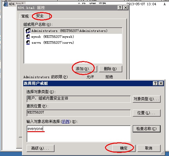 消息類(lèi)型選擇“文件”,指定網(wǎng)站目錄下的404文件。 然后給404文件everyone可讀權(quán)限,右鍵404文件--屬性--安全,添加everyone可讀,如圖所示:
